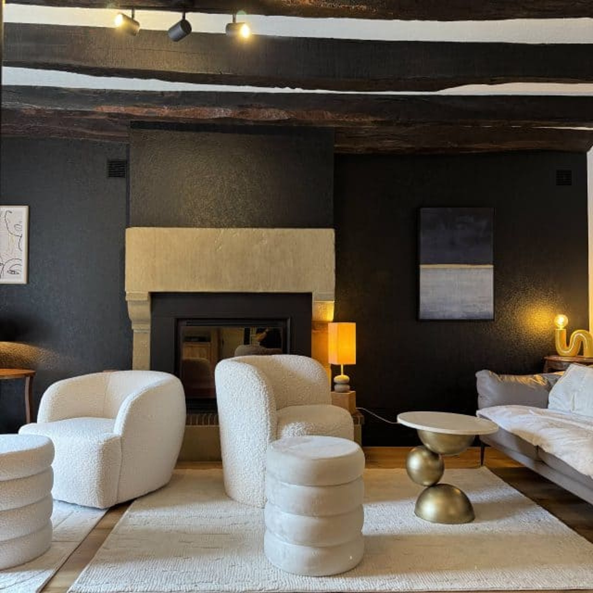Le séjour a fait l’objet d’une rénovation complète : réagencement, mise en valeur des poutres et nouvelles teintes murales.